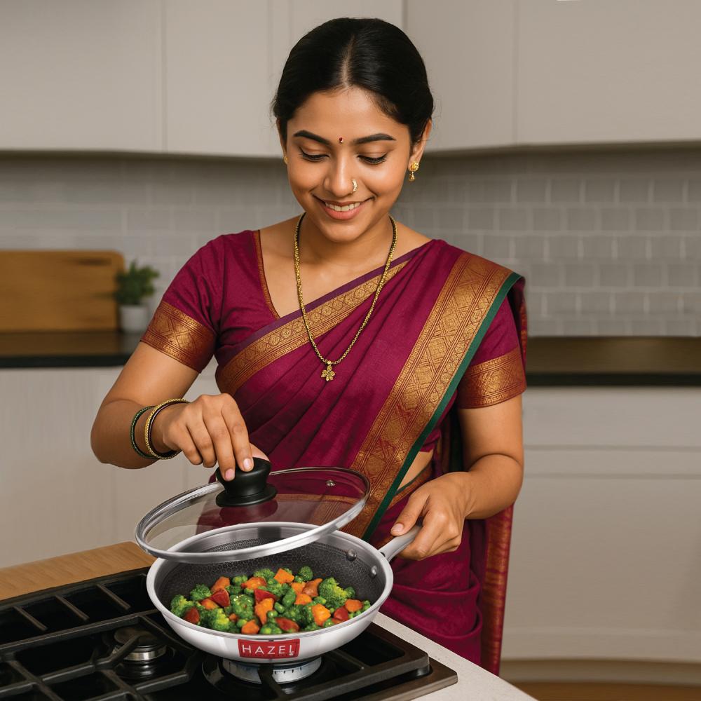 The HAZEL Honeycomb Triply Frying Pan is engineered for precision and durability, making it an indispensable tool for every kitchen. This 22cm, 1-liter pan combines the robust heat performance of Triply stainless steel with a unique Honeycomb non-stick coating. The triply body ensures fast and perfectly even heating, while the honeycomb pattern protects the non-stick surface, offering lasting performance and effortless food release for everything from perfect omelets to crisp stir-fries.