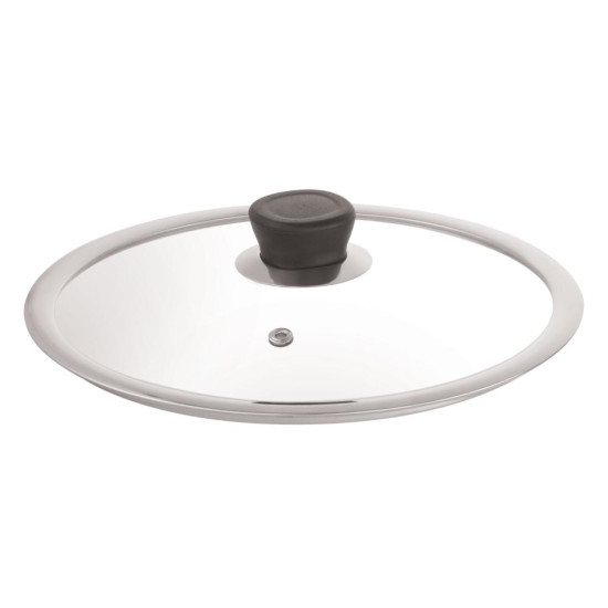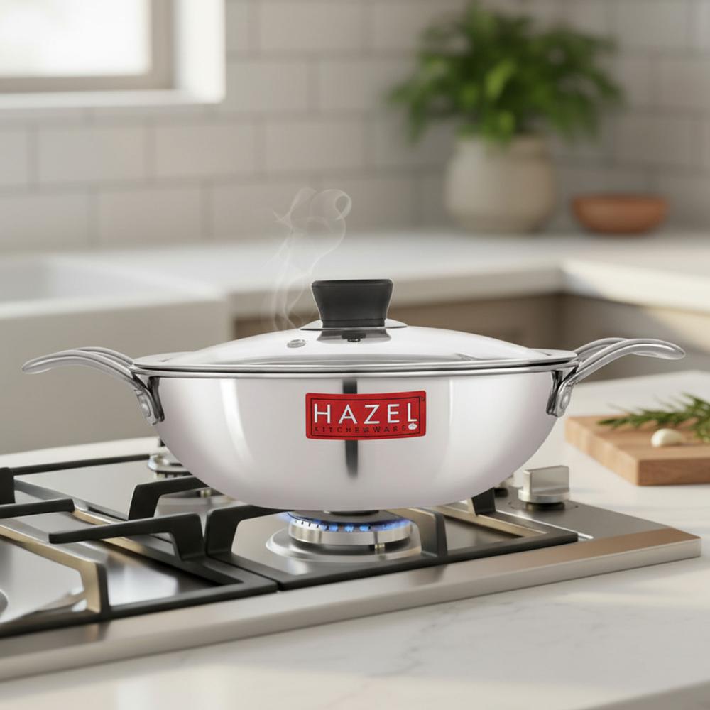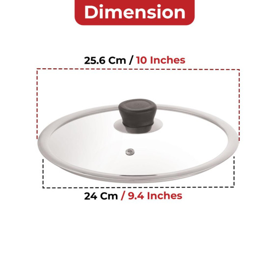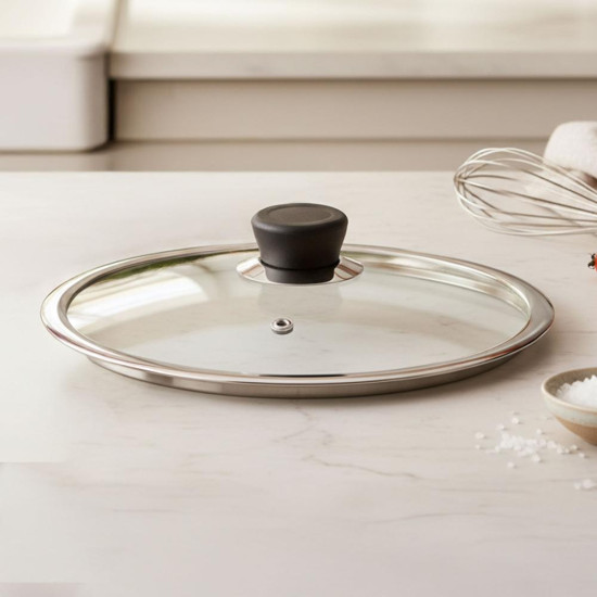 This Hazel 24 cm Glass Lid is the essential upgrade for your favorite cookware, ensuring a perfect seal for 24 cm diameter vessels. Ideal for use with Hazel\'s Tri-Ply Stainless Steel Kadai, Tasra, and Frying Pans, this lid is constructed from robust, heat-resistant tempered glass. This clear visibility allows you to easily monitor your cooking progress without needing to lift the cover, thereby locking in heat, steam, and nutrients for faster, more flavorful results. The lid is fortified with a durable stainless steel rim and includes a comfortable, heat-safe knob for secure handling. It\'s the convenient, durable, and attractive solution for more efficient cooking.