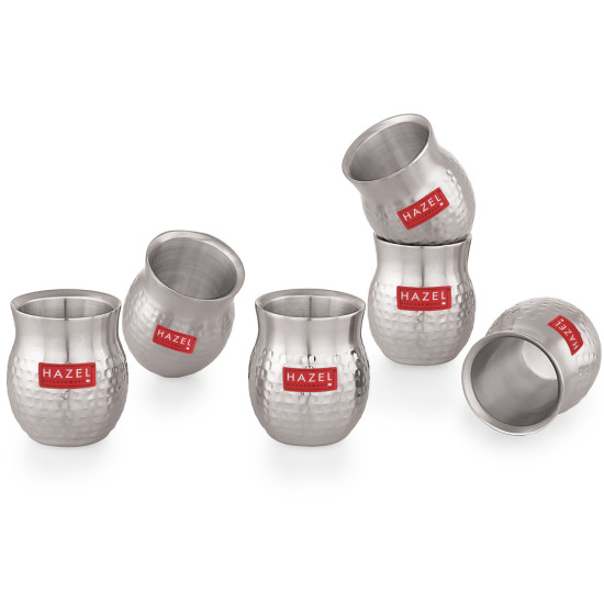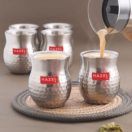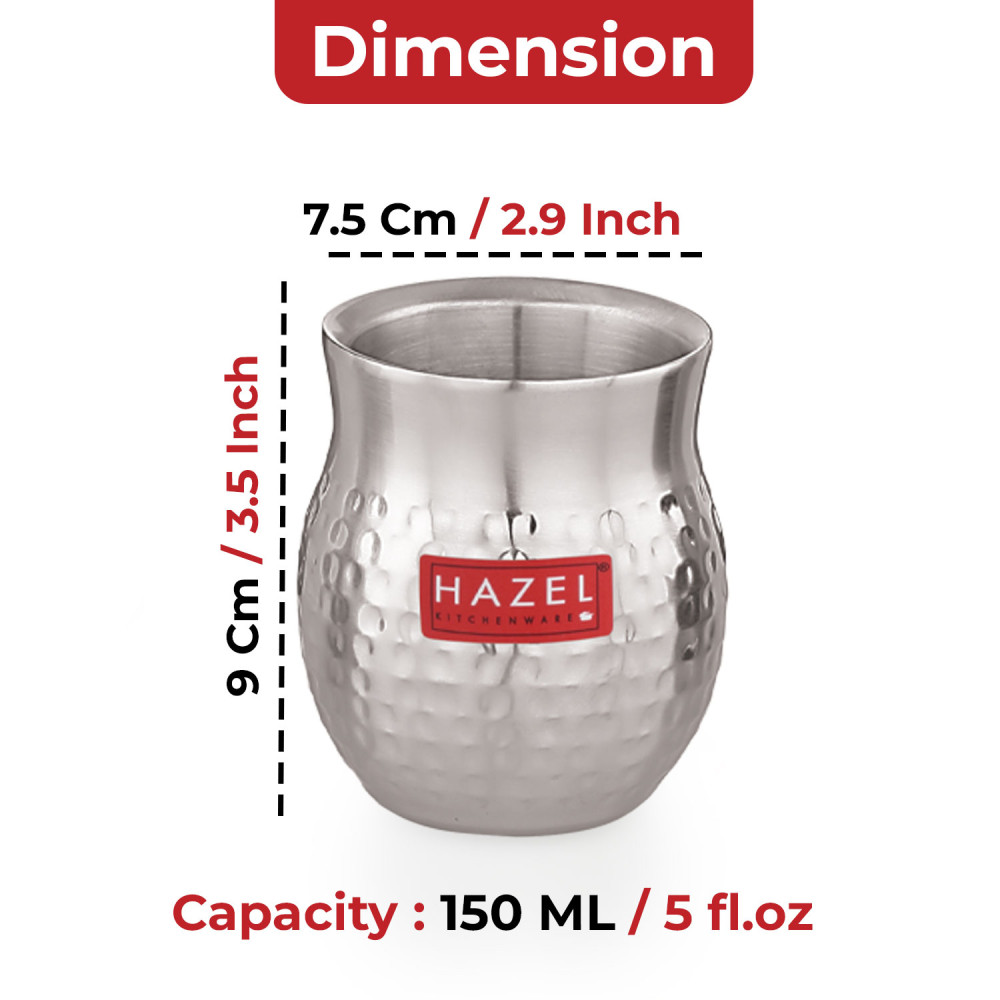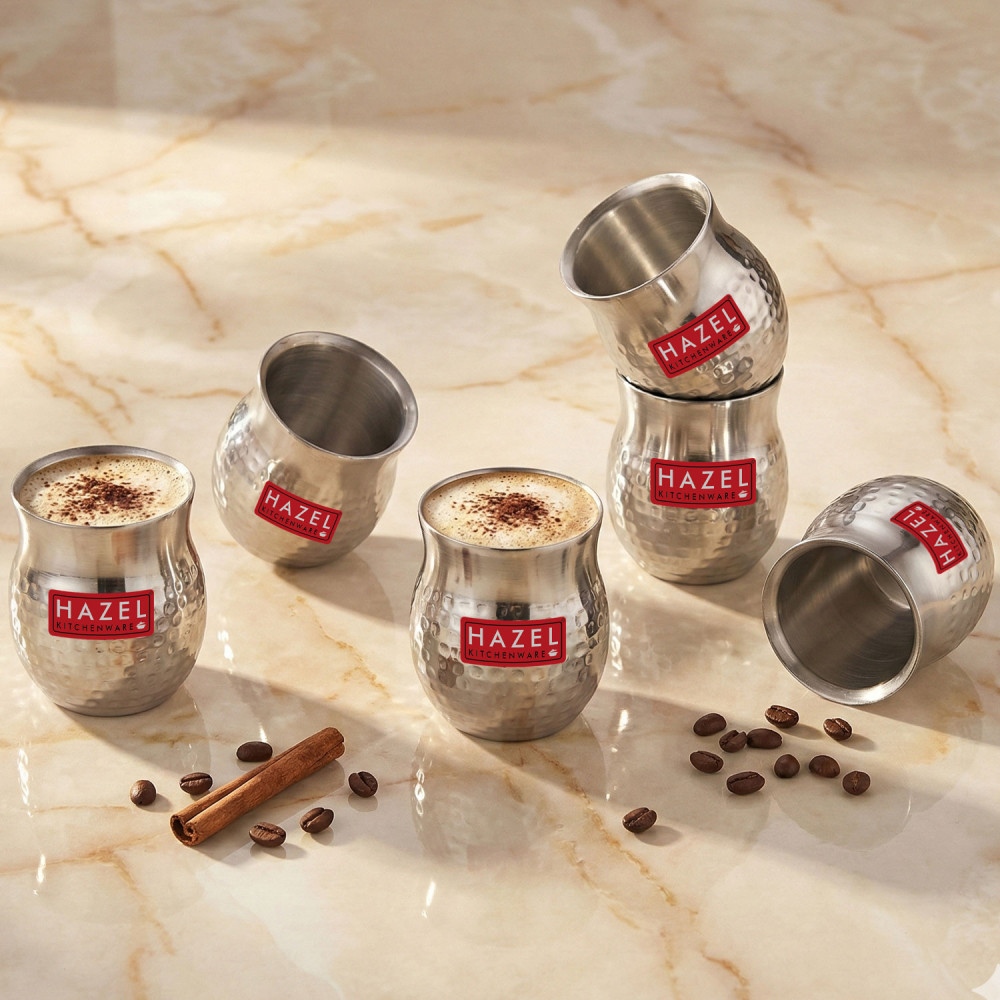Upgrade your beverage serving with the HAZEL Double Wall Stainless Steel Kullad – Set of 6. Designed with double-wall insulation and a stylish hammered finish, these 150 ml kullads keep drinks at the right temperature while offering a comfortable grip. Ideal for family use, guests, festive occasions, and traditional tea service.