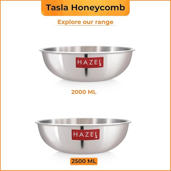 Elevate your cooking with the HAZEL Triply Non-Stick Tasla, designed with advanced triply stainless steel for enhanced durability and even heat distribution. Featuring a unique honeycomb patterned body, this 2.5L Tasla is resistant to scratches and corrosion, maintaining its sleek appearance over time. The polished interior finish ensures effortless food release and easy cleanup, making it perfect for daily use. Ideal for use on gas, induction, and electric stove tops, this cookware offers quick and even heating for efficient cooking. It is also metal spatula friendly, allowing you to cook with ease and without worry of damaging the surface. The included lid helps retain heat and moisture, ensuring your meals are cooked to perfection every time.