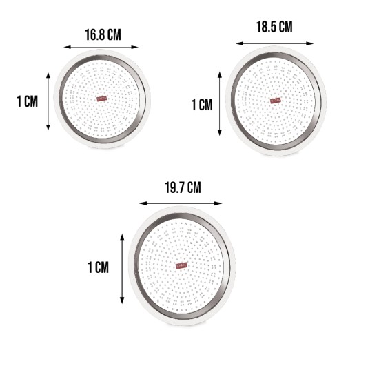Small Lid Dimension : 16.8 x 16.8 x 1 cm (LxBxH), Diameter : 16.8 cm, Weight : 70 gm. Medium Lid Dimension : 18.5 x 18.5 x 1 cm (LxBxH), Diameter : 18.5 cm, Weight : 90 gm. Large Lid Dimension : 19.7 x 19.7 x 1 cm (LxBxH), Diameter : 19.7 cm, Weight : 90 gm.