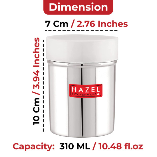 Dimension : 7 x 7 x 10 cm (LxBxH), Diameter : 7 cm, Weight : 100 Grams, Capacity : 310 ML.