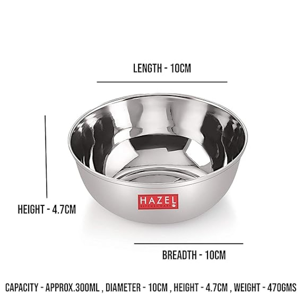 Packaging content (Approximate) : Set of 6 Plates Diameter: 10 cm Height: 3.75 cm Weight : -approximately 470 gms Material Used:-Stainless Steel Product Description: Vatti height is dipper & can be used for serving various liquid food dishes on\"\"