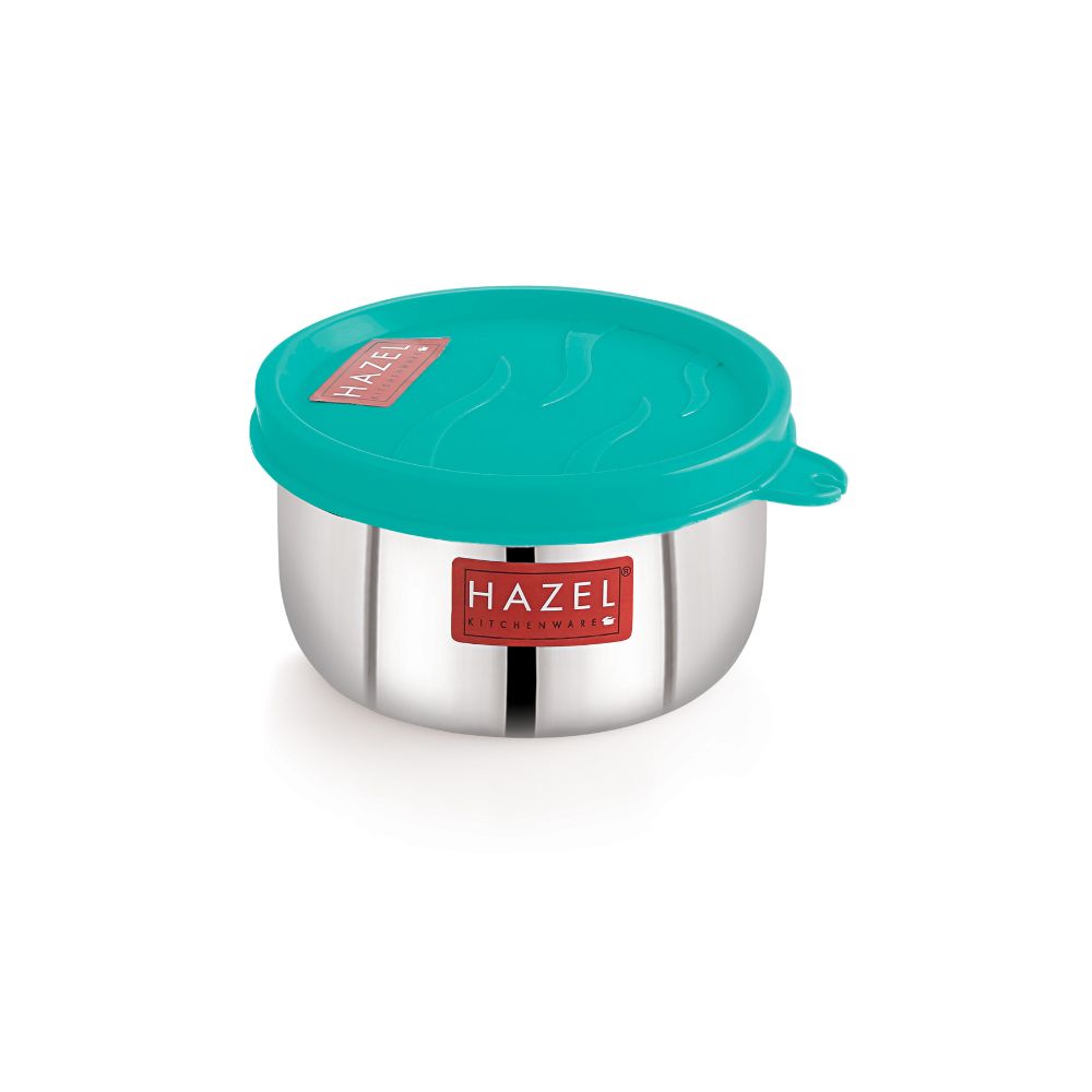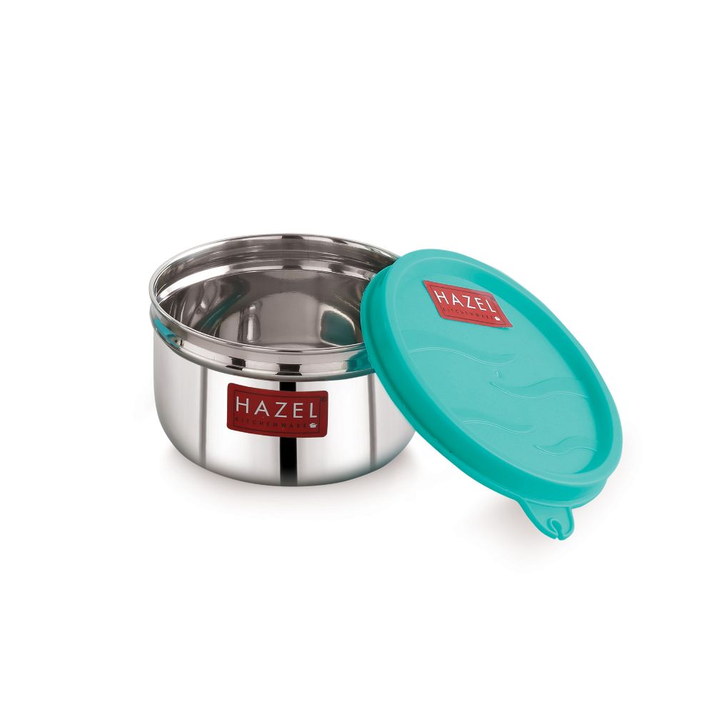 Introducing our HAZEL Air Tight Leak Proof Stainless Steel Containers with Plastic Lid, the perfect solution for all your tiffin and food storage needs. HAZEL containers are designed to keep your food fresh and secure, whether you\'re taking it to work or storing it in the refrigerator. Made from high-quality stainless steel, these containers are durable, rust-resistant, and easy to clean. The plastic lids are also durable and provide an airtight seal, preventing any leaks or spills. You can trust this container to keep your food fresh and secure during transportation or storage. HAZEL containers are ideal for tiffin or lunch box use, as well as food storage at home. The compact size makes it easy to pack in a bag or backpack, and the airtight seal ensures that your food stays fresh and delicious. It\'s also great for storing leftovers or meal prep, as the stainless steel material is safe for use in the refrigerator or freezer. The stainless steel material is also safe for use in the dishwasher, making cleanup a breeze. In summary, HAZEL Air Tight Leak Proof Stainless Steel Container with Plastic Lids is the perfect solution for anyone looking for a high-quality and durable container for tiffin or food storage. The airtight seal and leak-proof design will give you peace of mind, knowing that your food is safe and secure. With its compact size, and dishwasher safe, and rust-resistant stainless steel material, this container is a versatile and convenient addition to your kitchen.