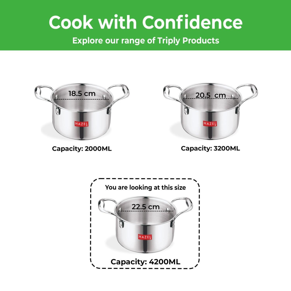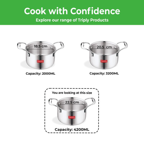 Triply Tope With Handle Dimension:- 33 x 24 x 11.75 cm (LxBxH), Diameter - 22.5 cm, Weight - 1400 gms, Height with Handle - 13 cm, Capacity - 4.2 L. Stainless Steel Lid Dimension:- 24 x 24 x 5 cm (LxBxH), Diameter - 24 cm, Weight - 330 gms, Height with Handle - 5 cm.