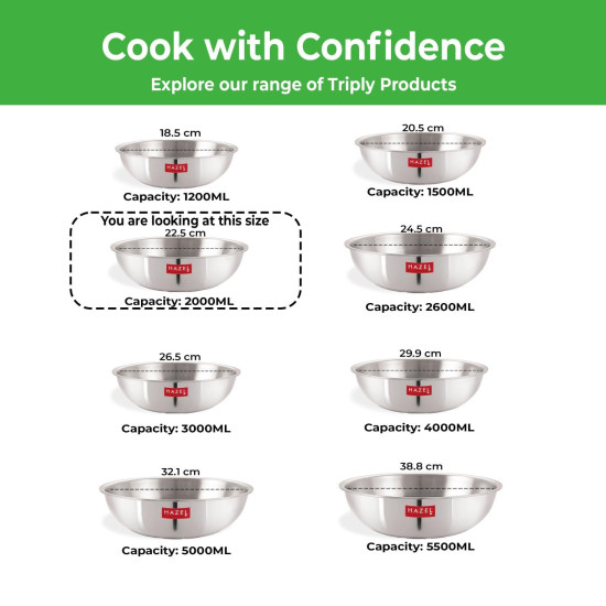 Triply Tasla Dimension :- 24 x 24 x 7.25 cm (LxBxH), Diameter - 22.5 cm, Weight - 820 gms, Capacity - 2 Ltr. Stainless Steel Lid Dimension :- 24 x 24 x 5 cm (LxBxH), Diameter - 24 cm, Weight - 330 gms, Height with Handle - 5 cm.